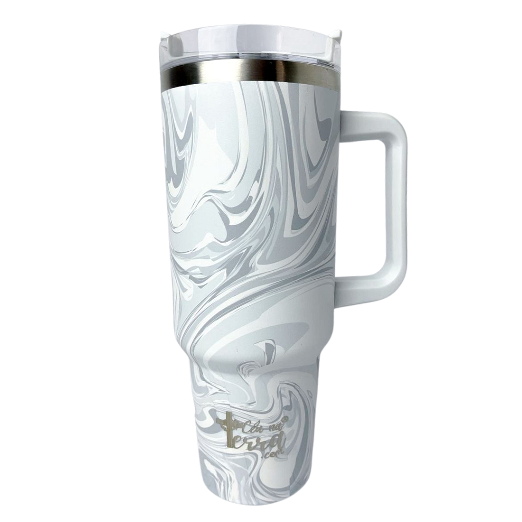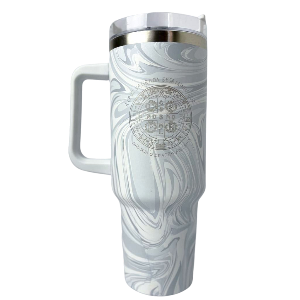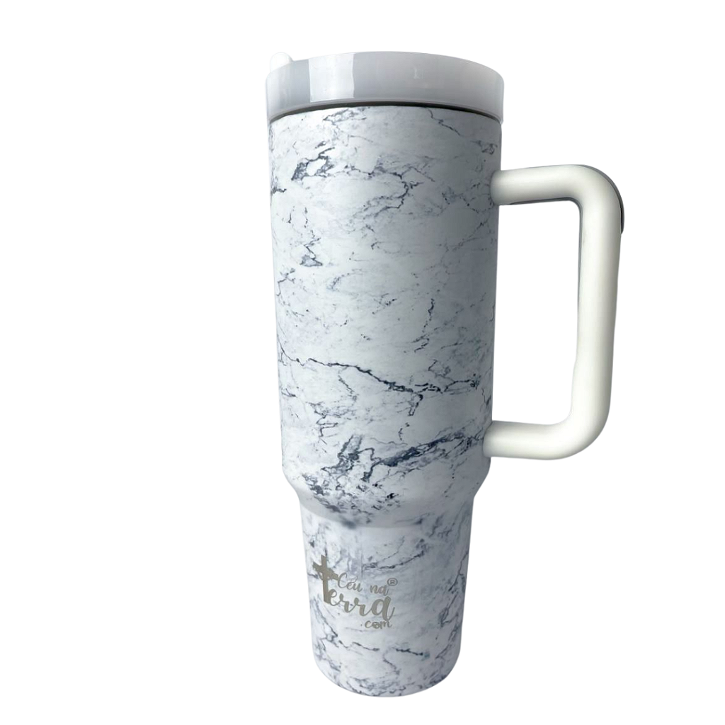 Leve sua fé e sua bebida preferida na temperatura perfeita para onde for — peça já o seu Copo Térmico Branco Mármore Cinza com Estampas Devocionais.