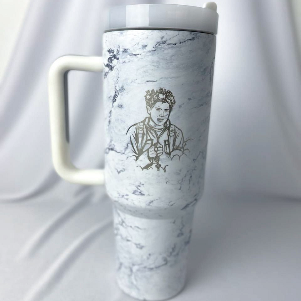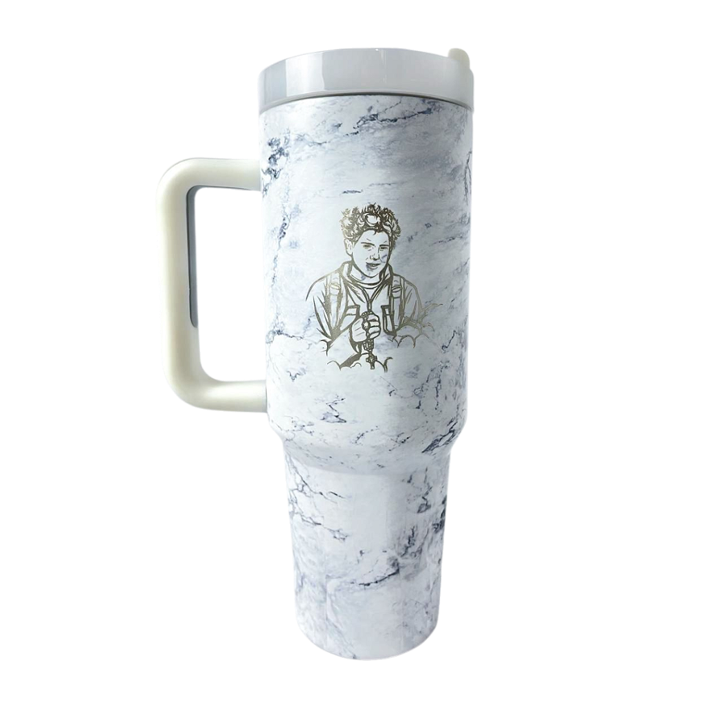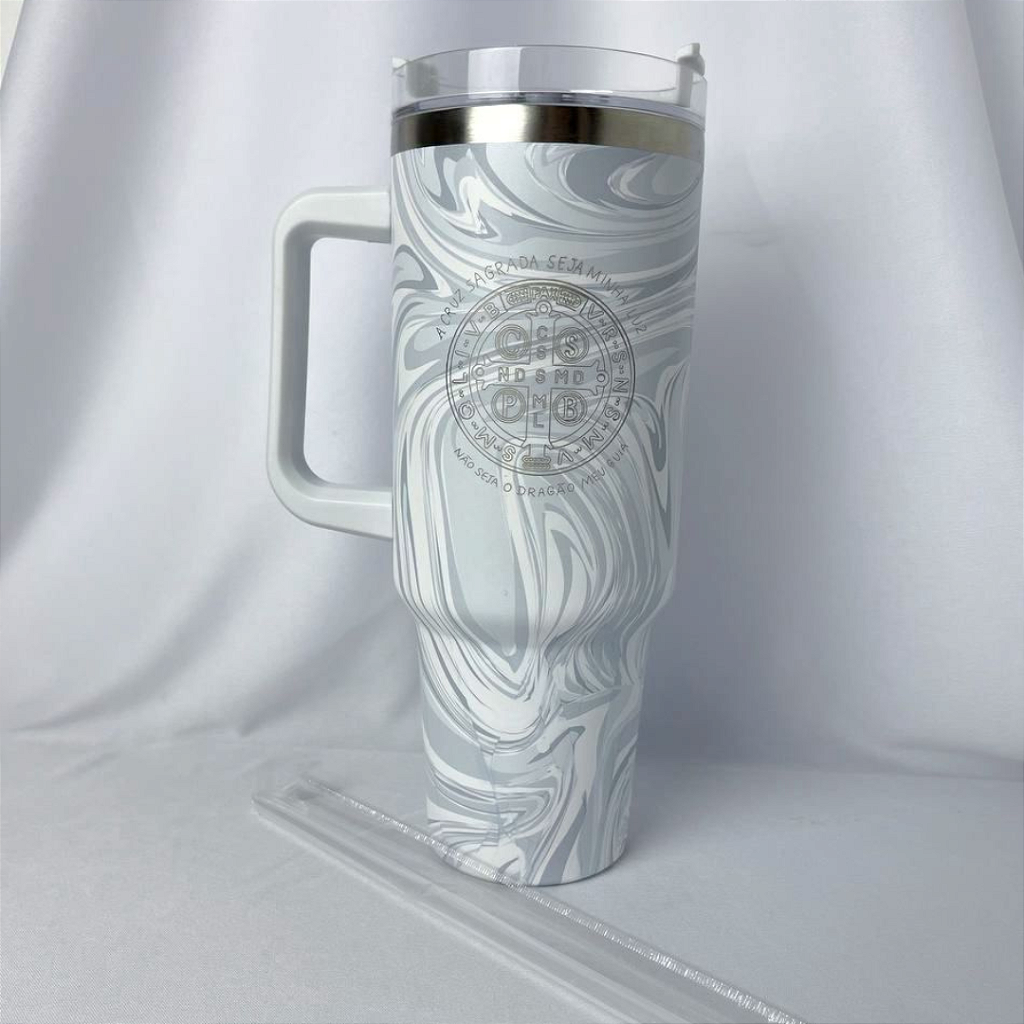 Leve sua fé e sua bebida preferida na temperatura perfeita para onde for — peça já o seu Copo Térmico Branco Mármore Cinza com Estampas Devocionais.