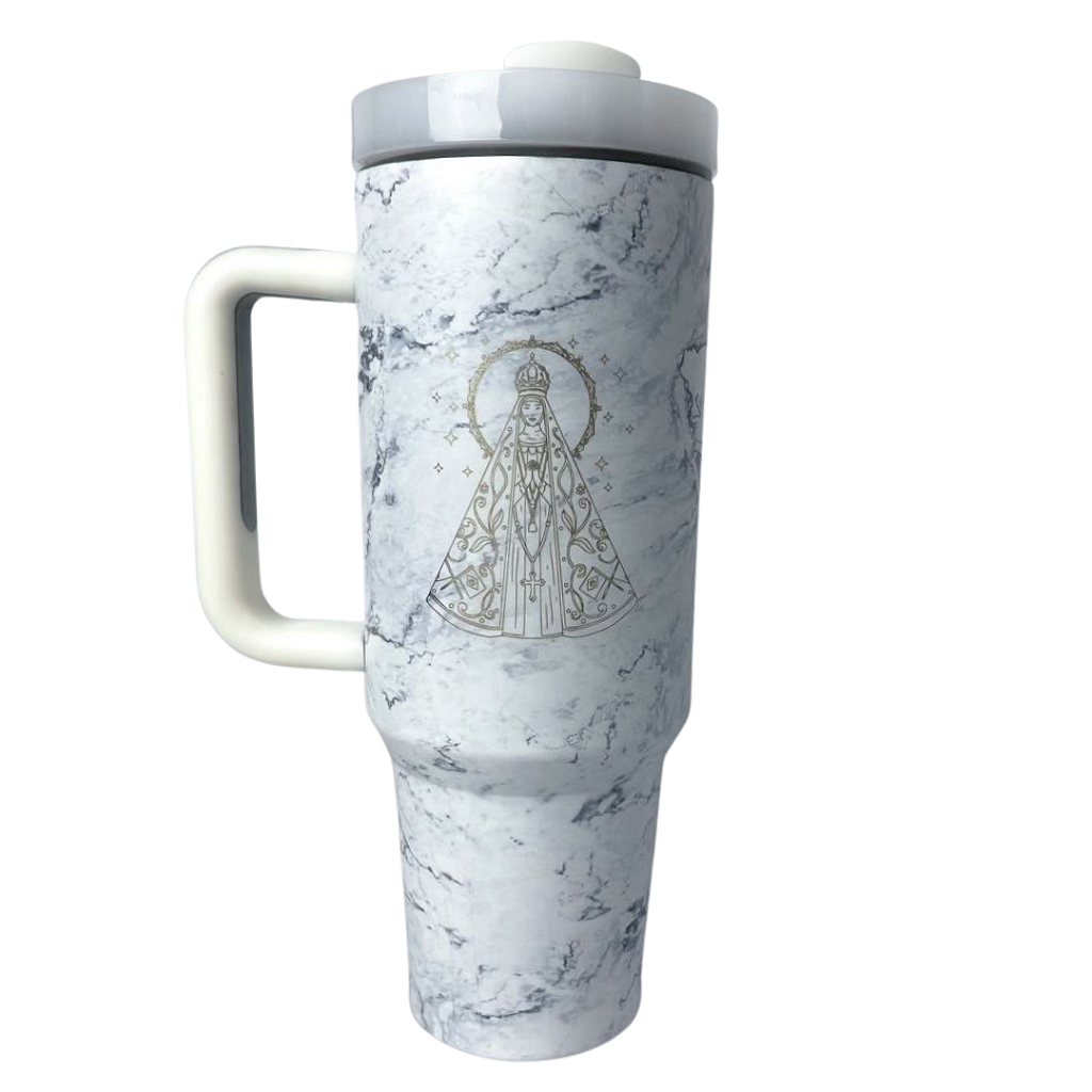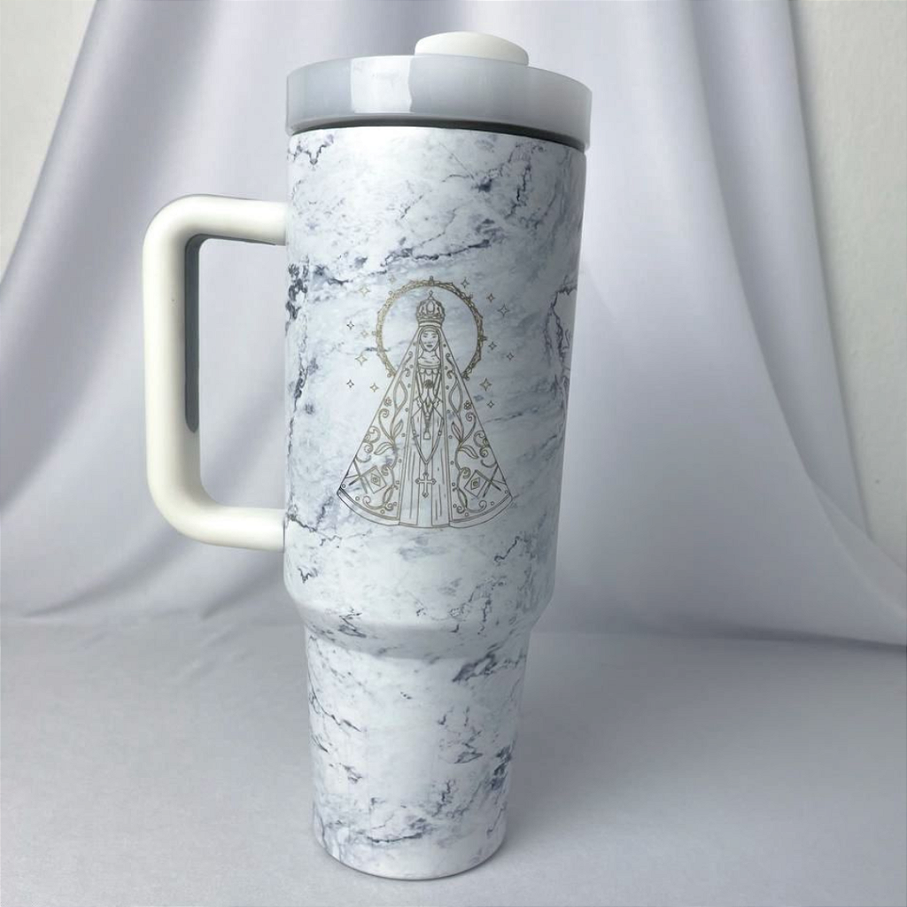Com acabamento sofisticado em mármore branco e cinza e ilustrações religiosas exclusivas, este copo é ideal para casa, trabalho, escola, viagens ou encontros de oração. A tampa com vedação segura e o canudo reutilizável oferecem conforto e praticidade para todas as idades.