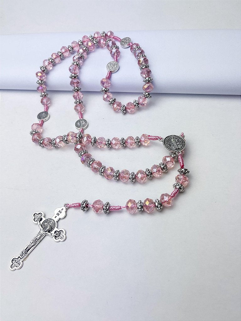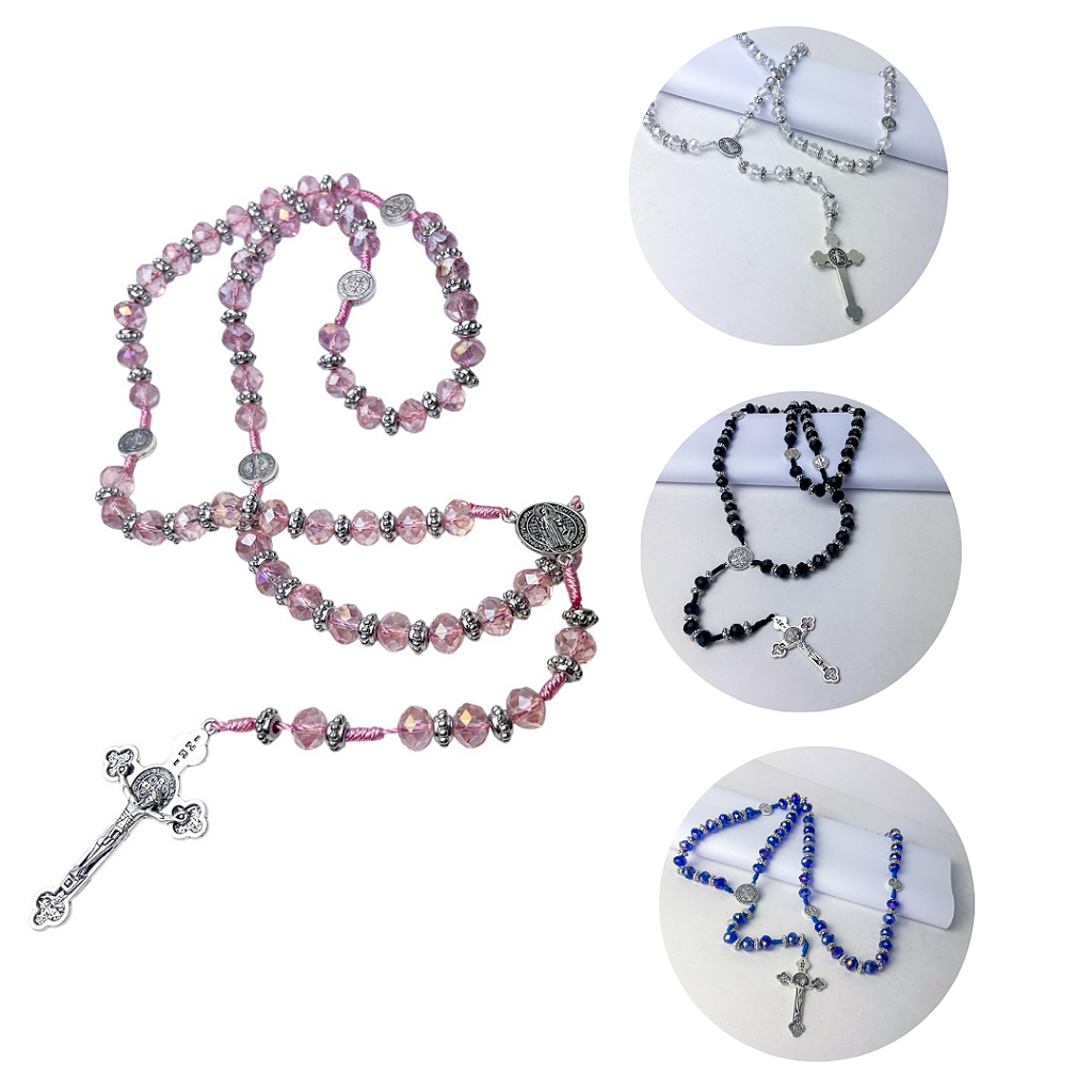Descubra o poder da oração com este belíssimo terço de cristal com acabamento em medalha de São Bento, disponível nas cores rosa, azul, preto e branco. Cada detalhe foi pensado para elevar sua espiritualidade e também decorar com delicadeza e fé os ambientes da sua casa ou do seu altar. Feito com contas facetadas que brilham suavemente, ele une beleza e devoção, tornando cada momento de oração ainda mais especial.